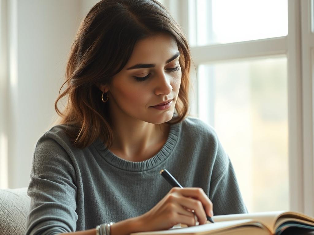A serene woman sitting peacefully in a sunlit room, surrounded